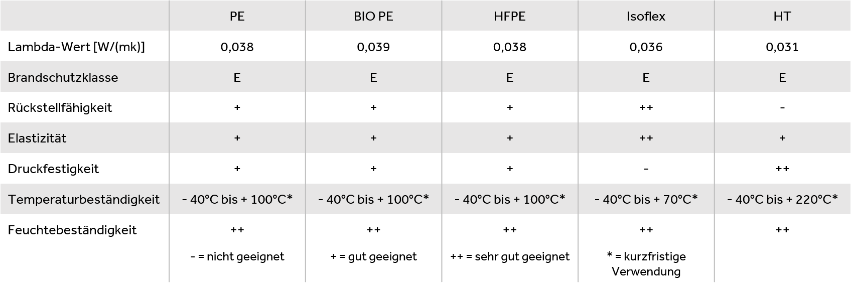 QualitätenPE-Schaum: für alle gängigen Anwendungen - ein vielseitiges Produkt, auf das Sie sich verlassen können. Bio- Isoflex-Schaum: Extrem hohes Rückstellvermögen speziell für Wickelanwendungen geschaffen. HFPE-Schaum: Halogenfreier PE-Schaum entwickelt für Anwendungen und Bauprojekte die strengen ökologischen Auflagen unterliegen. HT-Schaum: Durch die hohe Temperatur- und Chemikalienbeständigkeit lässt sich unser HT-Schaum bereits vor der Pulverbeschichtung oder Eloxierung im Bereich zwischen den thermischen Trennungen einbringen. Aufgrund seiner Steifigkeit lässt sich unser HT-Schaum auch nachträglich in bereits eingerollte Aluminiumverbunde einschieben.