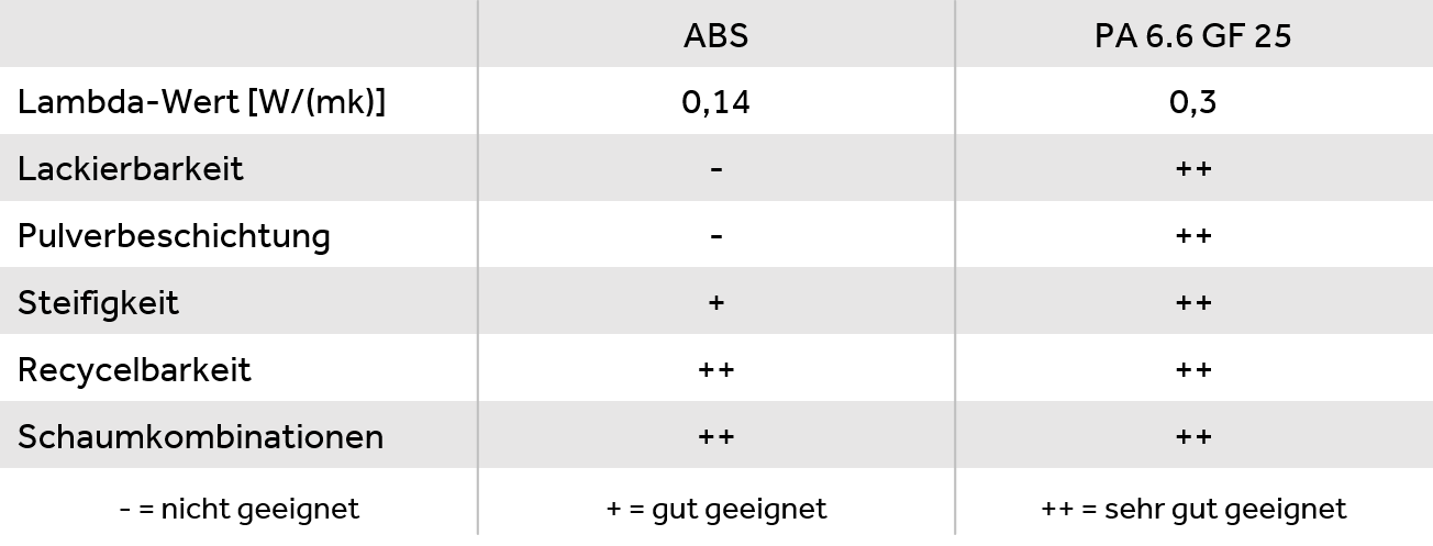 Unsere thermischen Trennungen aus Polyamid (PA) oder Low Conductivity Polyamid (LC-PA) mit Glasfaserverstärkung oder aus modifiziertem ABS sind maßgeblich dafür verantwortlich, den Wärmedurchgangskoeffizienten (U-Wert) zu senken, damit höhere Dämmwerte in Aluminiumverbundsystemen erreicht werden.